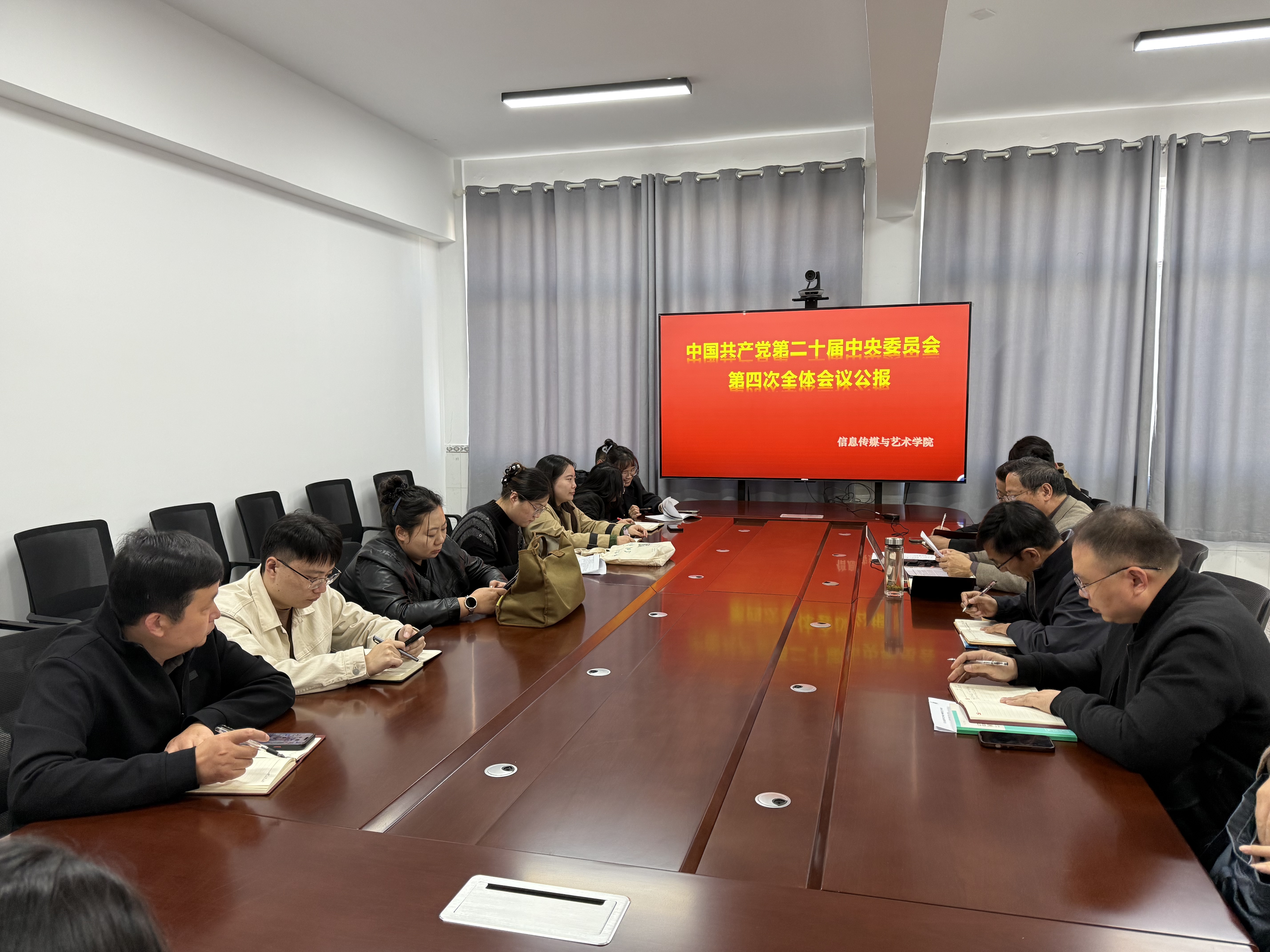 信息传媒与艺术学院组织开展本学期第十周政治学习会议,与会人员围绕"强国建设、民族复兴"战略部署,结合传媒艺术教育特色展开热烈研讨,刘希晨 摄影。